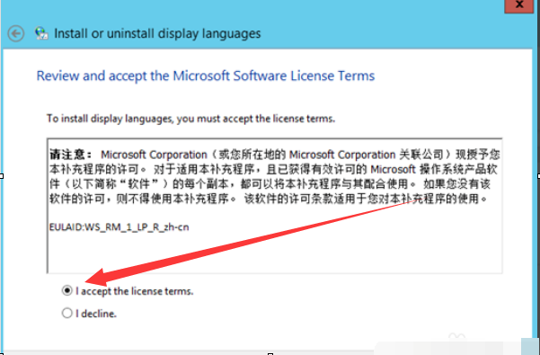 5、选择完对应语言包后,在安装界面会显示对应语言包语言,勾选“I accept the license terms”开始安装;