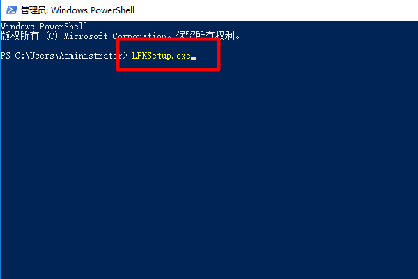 1、在powershell窗口,输入“LPKSetup.exe”回车打开安装程序界面;